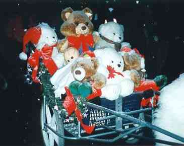 Here's Colette and Sam, with Sam's cart, waiting for the parade to start. There are more lights in the garland. We had to dust the snow off the bears before we started out on the real route...looked like Sam was hauling a cart full of snowmen!