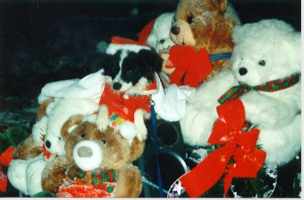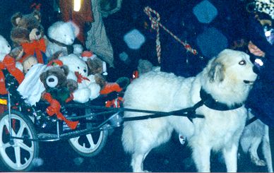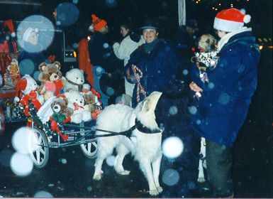The City of Cambridge, Ontario, held their Annual Santa Claus Parade on November 15, 1997. I organized a group we called Christmas Canines, as we weren't affiliated with any club or organization. Lots of people came out, and we had a number of carting dogs. The following pictures show some of what we did.