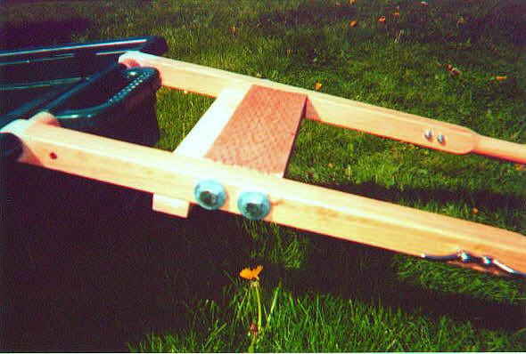2x4 Attachment Detail: I attached the shafts and spacer beads to the wagon first, then attached the 2x4 between them. In retrospect, it might be better to assemble the shafts to the 2x4 brace first, on a flat surface, of course. To attach the 2x4, you will need to drill a hole for each lag screw through the shaft and into the end of the 2x4 brace. I used 3/4 inch lag screws with large fender washers, and drilled the hole a little small, so the screws would not be loose. I had to use a ratchet / socket wrench to tighten them down. To get the holes in the 2x4 just right, I first held it in place, marked where it was on the shafts, drilled small pilot holes in the shafts first, since they are hardwood. I then held the 2x4 in position again, this time drilling small pilot holes in the 2x4 through the holes I had just drilled in the shafts. I stuck one nail (loosely, just to act as a pin) into each set of holes to hold the 2x4 in position. Then, I just removed one nail at a time, drilled the larger size hole I needed, and inserted the lag screw into the new hole. (Ignore the 1x2s, which were my first attempt at bracing the shafts together...too flimsy! I just left them on their to avoid having a hole in the wood!) I originally attached low-profile rope cleats on the outside of the shafts, for a shaft-pull attachment. They weren't low profile enough, and after getting jabbed in the back of the calf by them, I decided this could be dangerous when navigating through crowds at festivals, etc. I have since installed two screw in eye-bolts (screw eyes), in the front edge of the 2x4 brace, for attaching traces from a carting harness.