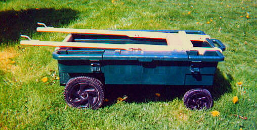 Wagon with shafts folded back. I had to round off the top and bottom edges of the shafts so they wouldn't catch when they are folded back...the electric sander took the corners off easily and quickly. This is a nice feature for when your dog is not hooked to the cart, especially in crowded places, like festivals, etc.